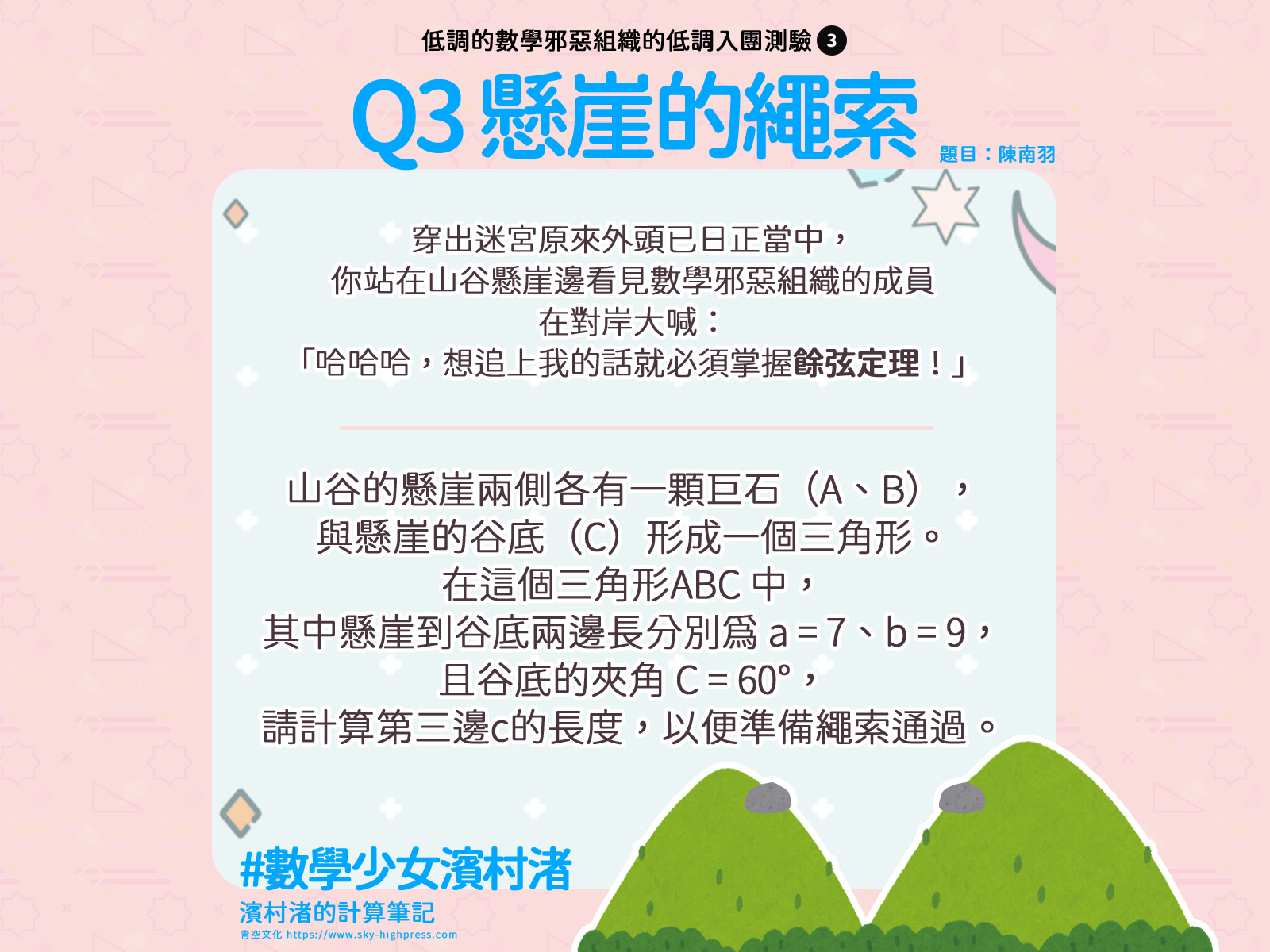 穿出迷宮原來外頭已日正當中,你站在山谷懸崖邊看見低調的數學邪惡組織的成員在對岸大喊:「哈哈哈,想追上我的話就必須掌握餘弦定理!」