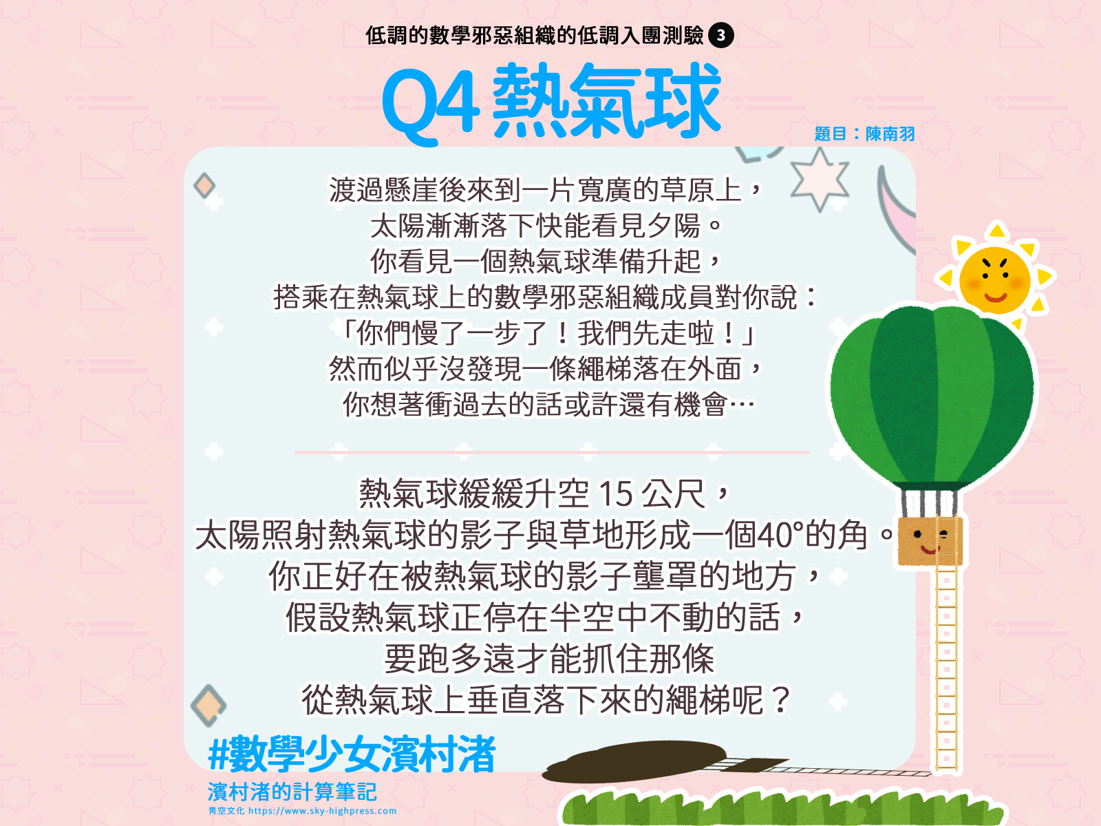 渡過懸崖後來到一片寬廣的草原上,太陽漸漸落下,再過一下就能看見夕陽。你看見一個熱氣球準備升起,搭乘在熱氣球上的數學邪惡組織成員對著趕來的你說:「你們慢了一步了!我們先走啦,後會有期!」
