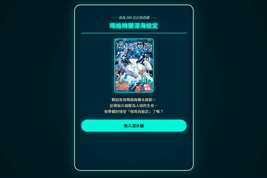 - 深海檢定題目以瑪格梅爾深海水族館VOL.1~3集人物、故事、生物等內容為主,鑑定結果僅供娛樂,並不會作為抽獎依據。